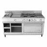 Estufa maestra con freidor Electrico de inmersión de 4.5 lts, capacidad de 12 kgs/hr, plancha en fierro fundido calentada por 3 quemadores lineales, asador de carnes a gas y carbón fósil con parrilla de diseño para rayado de carnes, 4 quemadores de superficie tipo octagonal de fierro fundido de 26,000 btu cada uno, gratinador bajo plancha con parrilla y charola de derrames y horno comercial inferior totalmente porcelanizado, equipado con quemador en "h" de fierro fundido accionado por termostato a gas de 0 a 300° c. construida en acero inoxidable tipo 430, válvulas san-son.