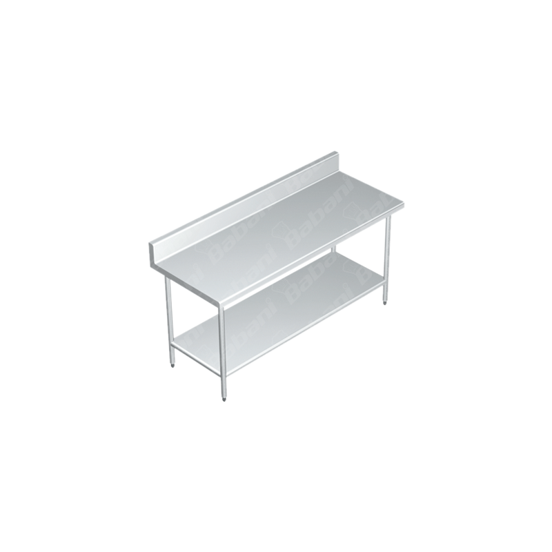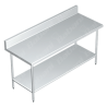 MESA DE TRABAJO A MURO CON ENTREPAÑO, CUBIERTA LISA CON LAMBRIN POSTERIOR, FABRICADA EN ACERO INOXIDABLE. CALIBRE 18, ENTREPAÑO INFERIOR EN CALIBRE 20. MONTA SOBRE ESTRUCTURA TUBULAR DE 1 1/2" Y DE 1 1/4" DE Ø, MIDE 2.40 X 0.70 X 0.90 MTS. ACERO